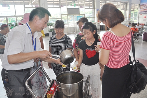 入夏以來,氣溫不斷升高,熱浪滾滾襲來,為保障奮戰(zhàn)在生產(chǎn)一線員工的工作安全與身心健康,為廣大旅客和駕乘人員做好服務,南充汽車客運站認真搞好防暑降溫工作,在高溫時段堅持每天熬制綠豆南瓜湯,為旅客、站務人員和駕乘人員送清涼。 車站購買綠豆50斤、南瓜50斤、冰糖20斤等食品,每一個高溫日,組織行政工作人員和“匡紅艷愛心班”人員將熬制好的綠豆南瓜湯送到旅客和一線員工、廣大駕乘人員手中,受到了大家的一致好評。 一位來自內(nèi)江的旅客說到:“沒想到你們車站還給旅客送綠豆湯解暑,我在其它地方還沒有碰到過。”工作人員一邊送綠豆湯一邊答道:“高溫季節(jié),我們天天都要給大家送,歡迎你再來品嘗。”旅客由衷的贊嘆道:“你們的服務真好,謝謝!”