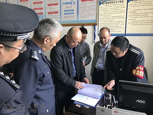 省公安廳治安總隊(duì)調(diào)研員蘭金東(左三) 檢查西充客運(yùn)中心反恐防暴軟件資料