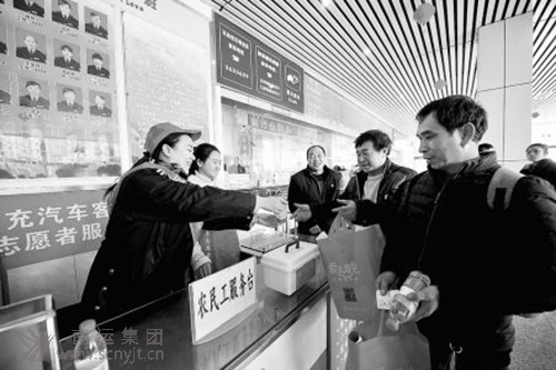 1月21日上午,家住宜賓高縣的李世強和幾名老鄉(xiāng)來到南充汽車客運站,準(zhǔn)備乘車回家。在站前廣場上,他們收到了福袋禮包,在站內(nèi)收到了工作人員送上的礦泉水。隨著春運大幕開啟,記者在南充各大汽車客運站看到,車站紛紛提供溫馨服務(wù),讓農(nóng)民工順暢返家。 李世強和老鄉(xiāng)一直在營山縣一家工地務(wù)工,隨著春節(jié)臨近,為了避開春運高峰,他們決定提前返家。21日上午,他們扛著大包小包來到南充汽車客運站站前廣場。在嘉陵區(qū)總工會、人社局、團(tuán)區(qū)委組織的農(nóng)民工服務(wù)點,他們不僅收到了工作人員遞上的裝有“福”字的福袋、對聯(lián)、紅包等禮品,還收到了工作人員送上的《安全生產(chǎn)與職業(yè)健康知識讀本》《勞動者求職須知》《勞動者維權(quán)須知》等宣傳資料。站內(nèi)設(shè)有農(nóng)民工服務(wù)臺,車站工作人員還為他們送上礦泉水!吧鐣绱岁P(guān)愛農(nóng)民工,讓我們感到很溫暖!崩钍缽娬f。 為了方便農(nóng)民工返家,南充汽車客運站專門設(shè)置了農(nóng)民工售票窗口、檢票通道,還設(shè)置了“農(nóng)民工報平安”免費親情電話。記者在市內(nèi)其他汽車客運站也看到,車站均推出了相應(yīng)的溫馨服務(wù)措施,讓農(nóng)民工高高興興地返家。 (李奎 林欣 陳村銘) ——摘自《南充日報》