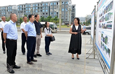 營(yíng)山縣副縣長(zhǎng)楊素梅(左一)在營(yíng)山汽車(chē)客運(yùn)站站前廣場(chǎng)的展板前,向?qū)巿?jiān)一行介紹營(yíng)山12328助力脫貧攻堅(jiān)工作開(kāi)展情況。