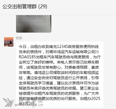 4月2日,南充市12345政務(wù)服務(wù)便民熱線向閬中市出租辦發(fā)送了一封《表揚信》,信中對南運集團閬中鴻運汽車運輸有限公司的一位司機——川RDA0185鴻運出租車駕駛員陳星吉表示了高度贊揚。 《表揚信》中提到,乘客在乘坐的哥陳星吉駕駛的出租車時,深切體會到了他極佳的耐心以及對乘客的細致照顧。即便面對飲酒的乘客,陳星吉也表現(xiàn)出了極大的寬容和關(guān)懷,確保了乘客的安全和舒適。他的專業(yè)能力和優(yōu)質(zhì)服務(wù)無疑對出租車行業(yè)產(chǎn)生了正面的影響。因此,《表揚信》的發(fā)送者希望通過熱線中心向陳星吉表達深深的感激和贊揚,以表彰他出色的服務(wù)態(tài)度和對乘客的關(guān)懷。 多年來,閬中鴻運汽車運輸有限公司的“的哥”、“的姐“們,為乘客服務(wù)的好人好事層出不窮,他們始終堅守南運集團“奉獻社會是神圣使命”的經(jīng)營理念以及出租公司“乘客大于我”的服務(wù)理念,將乘客的舒適與安全視為重中之重,致力于為每一位乘客提供最優(yōu)質(zhì)、最貼心的出行服務(wù)。 此次“的哥”陳星吉受到點贊,不僅是對他個人職業(yè)精神的肯定,更是對閬中鴻運公司整體服務(wù)水平的認可。鴻運公司對此深感自豪,并將以此為契機,進一步提升服務(wù)質(zhì)量,加強員工培訓,確保每一位司機都能像陳星吉一樣,以高度的責任心和專業(yè)的服務(wù)技能,為乘客提供安全、舒適、溫馨的出行體驗。同時,鴻運公司也將加大對優(yōu)秀出租車駕駛員的表彰和獎勵力度,激勵全體從業(yè)人員向榜樣學習,共同推動出租車行業(yè)的健康發(fā)展。 (閬中分公司 劉玉)