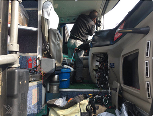 圖為安裝人員正在對衛(wèi)星定位車載視頻監(jiān)控系統(tǒng)進(jìn)行安裝