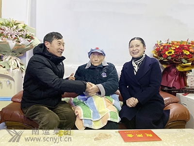 市交通運(yùn)輸局黨委書(shū)記、局長(zhǎng)劉曉梅(右一)在南運(yùn)集團(tuán)黨委書(shū)記、董事長(zhǎng)、總經(jīng)理王希平(左一)的陪同下,上門(mén)看望慰問(wèn)南運(yùn)集團(tuán)老紅軍曹守成。