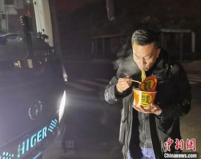 中新網(wǎng)南充1月22日電 (王爵 楊波)21日,是農(nóng)歷大年三十;楊洪,今年46歲,是廣東至四川南充線一名長途客運(yùn)司機(jī),是他安全完成春運(yùn)任務(wù)的16個(gè)年頭,21日19時(shí)20分左右,楊洪順利到達(dá)重慶武隆服務(wù)區(qū)后,抓緊吃了碗泡面,外加了兩個(gè)鹵雞蛋,這就是楊洪今年的年夜飯。 據(jù)了解,楊洪每年的年夜飯都是泡面加兩個(gè)鹵蛋,今年他也不例外。楊洪說,按照現(xiàn)在的速度,估計(jì)22日凌晨1點(diǎn)前就可以把旅客安全送達(dá)南充,盡量讓旅客安全準(zhǔn)時(shí)能回家過年。