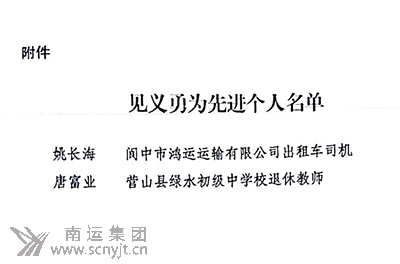 2020年12月底,經(jīng)六屆南充市人民政府第144次常務(wù)會(huì)議審議通過(guò),決定對(duì)姚長(zhǎng)海、唐富業(yè)2名見(jiàn)義勇為先進(jìn)個(gè)人進(jìn)行獎(jiǎng)勵(lì),每人0.5萬(wàn)元人民幣,并下發(fā)《關(guān)于對(duì)姚長(zhǎng)海等2名見(jiàn)義勇為先進(jìn)個(gè)人進(jìn)行獎(jiǎng)勵(lì)的決定》(南府發(fā)〔2020〕12號(hào))。 姚長(zhǎng)海52歲,蓬安人,現(xiàn)為南運(yùn)集團(tuán)閬中鴻運(yùn)運(yùn)輸有限公司里一名出租車(chē)駕駛員。2018年11月26日上午,姚長(zhǎng)海在搭乘一名女孩時(shí),發(fā)現(xiàn)該女孩滿面淚痕,于是他在途中勸導(dǎo)女孩,可對(duì)方并不回應(yīng),女孩下車(chē)時(shí)將車(chē)費(fèi)交到姚長(zhǎng)海手中便迅速離去。姚長(zhǎng)海感覺(jué)情況異常,于是將車(chē)停在路邊,下車(chē)尋找女孩。在尋至嘉陵江邊時(shí),姚長(zhǎng)海發(fā)現(xiàn)女孩已經(jīng)跳江,于是他奮不顧身躍入冰冷的江水中奮力施救,最終在岸上群眾的幫助下把輕生女孩救上岸,讓正處花季的生命得以延續(xù)。 姚長(zhǎng)海不但多次見(jiàn)義勇為,他在平時(shí)的營(yíng)運(yùn)過(guò)程中也始終堅(jiān)持做到扶老攜幼、熱情服務(wù)、文明待客,從不欺客宰客、從不拒載;凡拾到乘客遺失的物品,他都立即聯(lián)系失主或上交公司;每年高考,他都積極參加公司組織的免費(fèi)送考服務(wù);在同事遇到困難時(shí),他都會(huì)出手幫一把。他總是說(shuō):“誰(shuí)沒(méi)有困難的時(shí)候,自己能幫一把就幫一把”。 姚長(zhǎng)海在寒冷的嘉陵江中將17歲輕生女孩救上岸的英勇壯舉在《中央電視臺(tái)》《人民日?qǐng)?bào)》《新華社》《新京報(bào)》《四川日?qǐng)?bào)》等全國(guó)300多家新聞媒體和網(wǎng)絡(luò)平臺(tái)廣為報(bào)道,在全中國(guó)產(chǎn)生了廣泛的影響;他見(jiàn)義勇為和平時(shí)拾金不昧及助人為樂(lè)的先進(jìn)事跡感動(dòng)了社會(huì),獲得了應(yīng)有的榮譽(yù)和獎(jiǎng)勵(lì)。他曾入選“2018年感動(dòng)南充十大新聞人物”,先后被評(píng)為“閬中好人”、“最帥的哥”,并獲得阿里巴巴“2018年度正能量人物”和獎(jiǎng)金1萬(wàn)元;2019年他被評(píng)為“四川好人”,2020年獲得南充市政府的表彰和獎(jiǎng)勵(lì)。 姚長(zhǎng)海作為南運(yùn)集團(tuán)出租車(chē)駕駛員,為南充出租行業(yè)爭(zhēng)了光,為社會(huì)、也為出租車(chē)駕駛員及公司員工樹(shù)立了良好的榜樣。希望廣大員工向姚長(zhǎng)海同志學(xué)習(xí),做一個(gè)樂(lè)于助人、道德高尚、受人尊敬的人,為提升企業(yè)形象、建設(shè)平安南充作出新的更大貢獻(xiàn)。