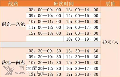 線路班次:南充-岳池每天11個(gè)班次,岳池-南充每天10個(gè)班次,具體時(shí)刻表如下: