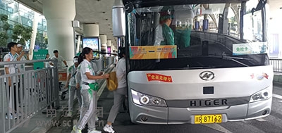 大學生運動員正在登上南運集團川R87162號黨員先鋒號駕駛員楊柳的“大運村----成都雙流國際機場”的豪華大巴。