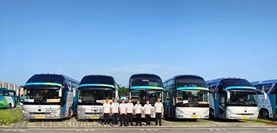 順慶分公司川R82059譚德平(左)和川R79876周永政(右)兩名駕駛員開行“大運村——東安湖體育公園主體育場”豪華大巴留影。